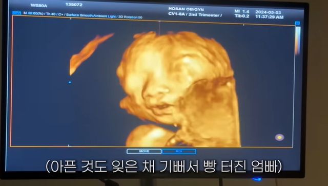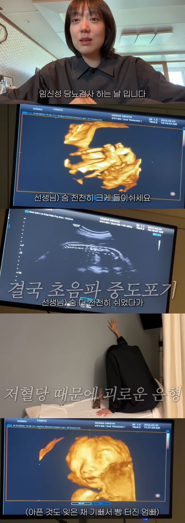 임당 검사 중 의사는 "한 달 사이에 배가 많이 나왔네. 산모가 숨도 차고 이제 누워 있기도 힘들다. 쇼크 올 수 있으니까 숨 크게 쉬어라. 대동맥이 눌리니까 어지러울 수 있다. 머리 쪽으로 가는 산소가 부족해져서 그렇다"고 말했다.
