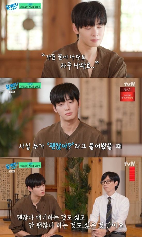 8일 방송된 tvN 예능 프로그램 '유 퀴즈 온 더 블럭'(이하 '유퀴즈')에는 차은우가 게스트로 출연해 세상을 떠난 동료 문빈을 추억했다.