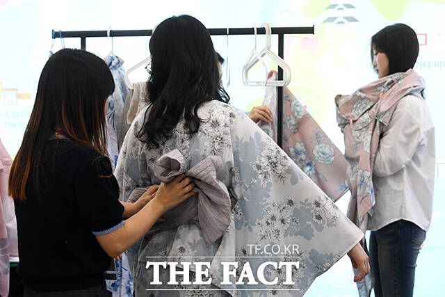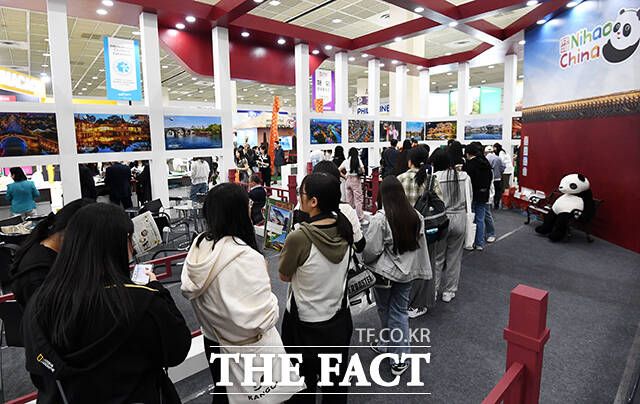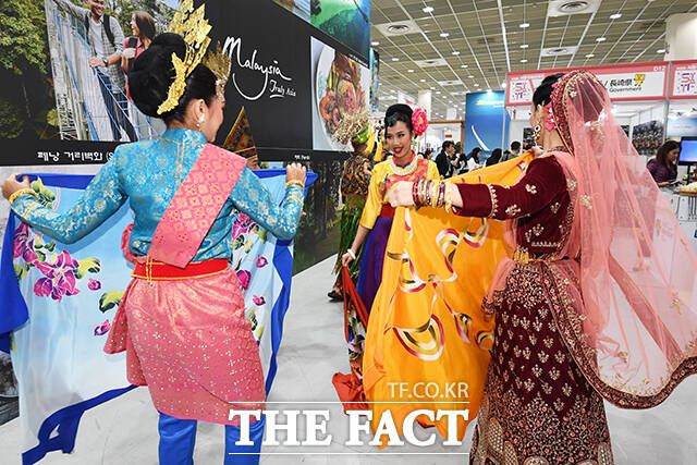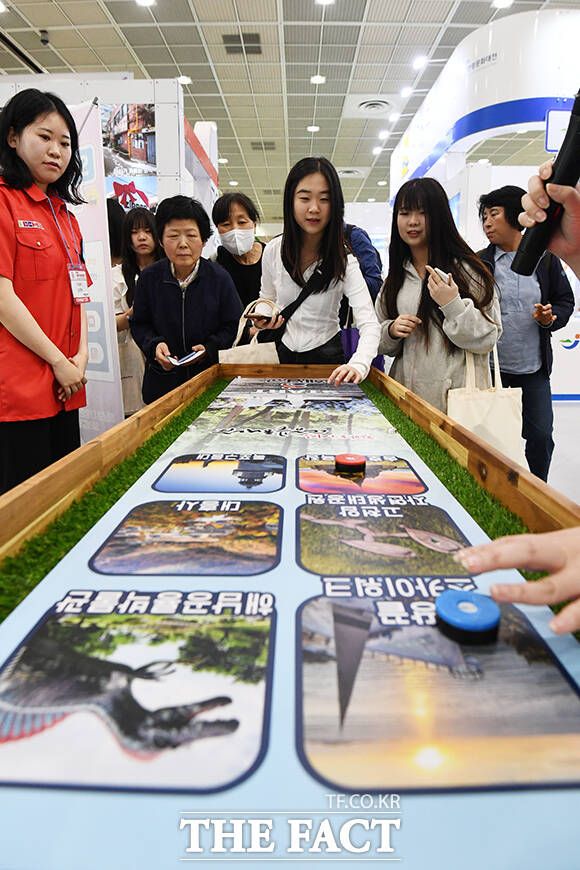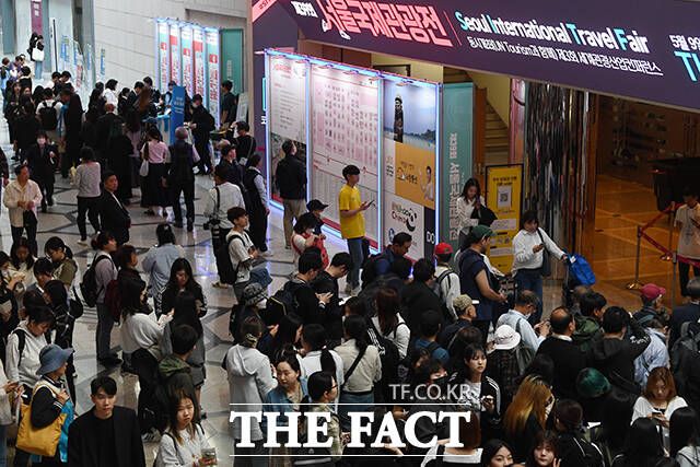 [더팩트ㅣ서예원 기자] 제39회 서울국제관광전이 9일 오전 서울 강남구 코엑스에서 열린 가운데 전시회를 찾은 관람객들이 부스를 체험하고 있다.