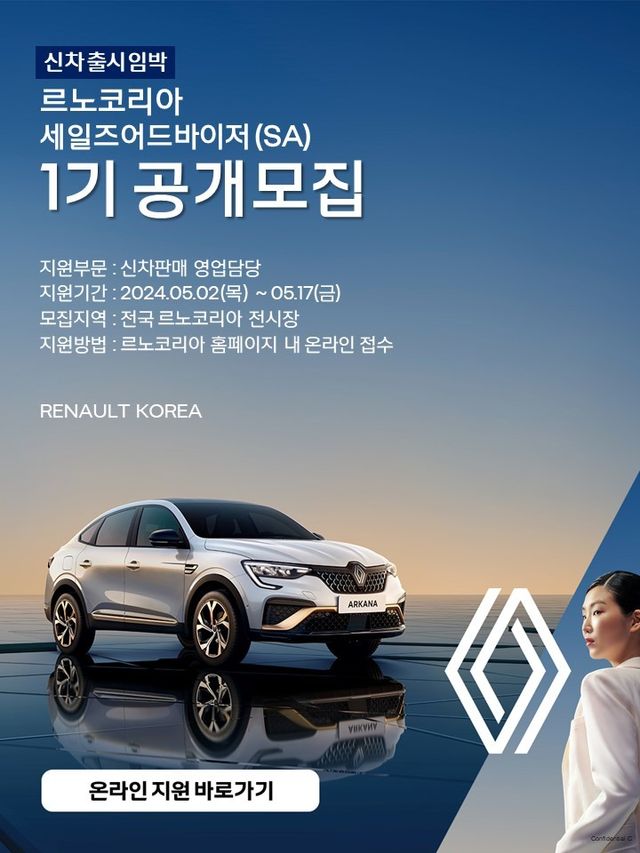 르노코리아는 하반기 신차 출시 준비를 위한 세일즈어드바이저 보강에도 나선다. 르노코리아 세일즈어드바이저 지원 희망자는 오는 17일까지 나이, 성별, 학력, 경력에 상관 없이 누구나 르노코리아 홈페이지 내 온라인 접수를 통해 지원 가능하다.