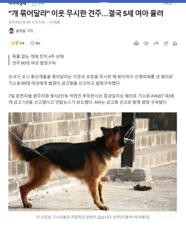 출처 : “개 묶어달라” 이웃 무시한 견주…결국 5세 여아 물려 (naver.com)