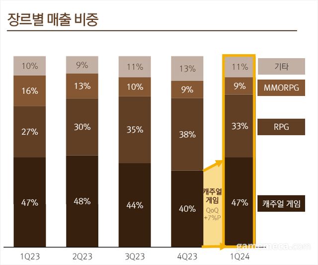 ▲ 넷마블 2023년 1분기부터 2024년 1분기까지 장르별 매출 비중 변화 (자료출처: 넷마블 IR 페이지)