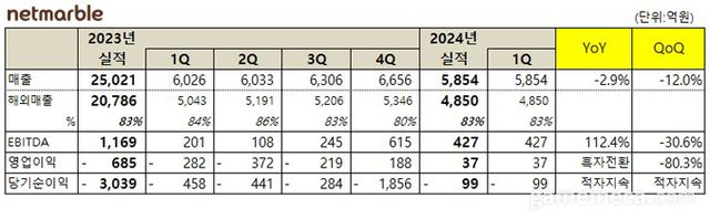 넷마블은 9일, 2024년 1분기 실적을 발표했다. 올해 1분기에 넷마블은 매출 5,854억 원, 영업이익 37억 원, 당기순손실 99억 원을 기록했다. 매출은 전년 동기보다 2.9% 감소했고, 영업이익은 흑자전환했다. 당기순손실은 적자폭을 줄였다.