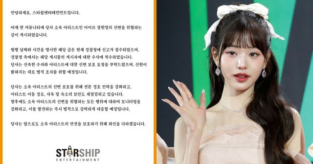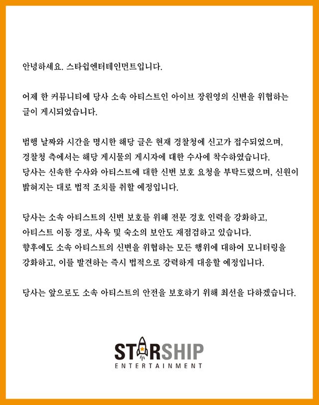 스타쉽은 "어제(8일) 한 커뮤니티에 당사 소속 아티스트 장원영의 신변을 위협하는 글이 게시됐다"며 "범행 날짜와 시간을 명시한 글은 현재 경찰청에 신고가 접수돼 게시자 수사에 착수했다"고 전했다.