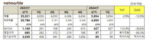 넷마블은 올해 1분기 매출은 5854억원, EBITDA(상각전 영업이익)는 427억원, 영업이익 37억원, 당기순손실 99억원을 기록했다고 9일 밝혔다.