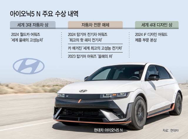 또한 아이오닉 5 N은 탑기어가 주관하는 2024 탑기어 전기차 어워즈에서 '최고의 핫 해치 전기차'로 등극했다. 아이오닉 5 N의 탑기어 수상은 지난해 11월 2023 탑기어 어워즈에서 '올해의 차'에 선정된 데 이어 두 번째다.