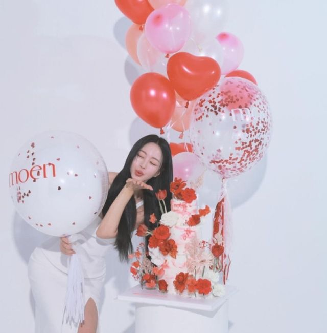 한예슬은 9일 자신의 인스타그램에 하트 이모티콘과 함께 여러 장의 사진을 게재했다. 사진 속 한예슬은 하트 풍선과 붉은 꽃이 있는 케이크 앞에서 다양한 포즈를 취하고 있다.