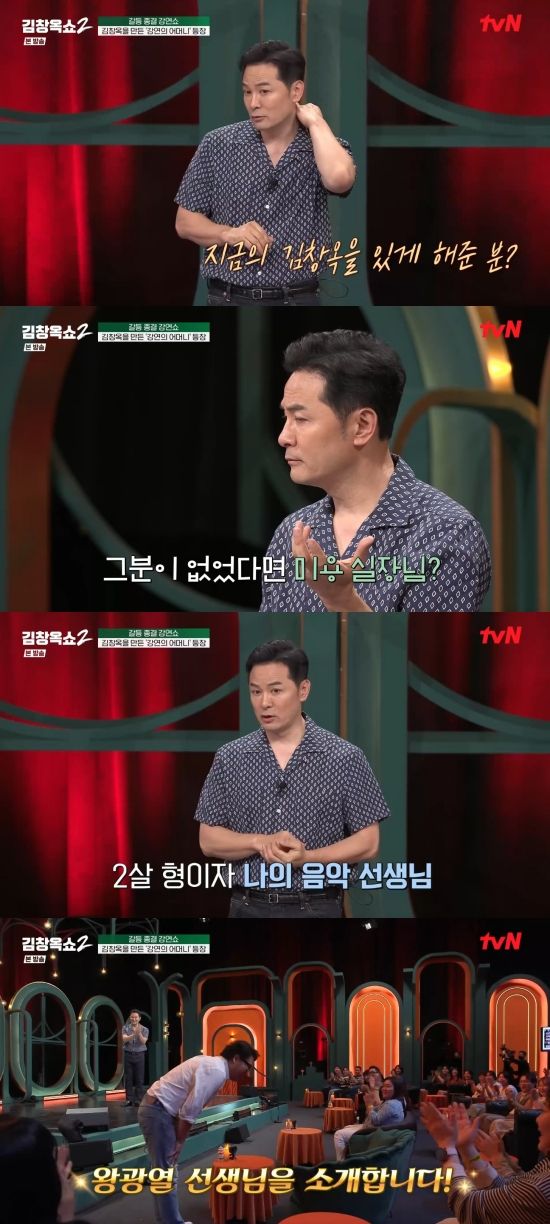 김창옥은 "제가 성악을 할 수 있게 해준 입시 선생님. 그분이 아니었으면 저는 음악대학에 못 들어갔을 거고 되게 다른 삶을 살았을 거 같다. 미용 실장님? 선생님이 저보다 2살 많으셨는데 절 지도하셨다. 우리 왕광열 선생님 소개하겠다"라며 밝혔고, 왕광열 씨를 소개했다.