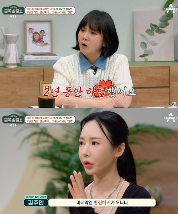 이날 김주연은 "3년차 무속인"이라며 "하고 싶어서 한 게 아니다. 갑자기 신병을 앓으며 반신마비까지 겪었다"고 말했다.