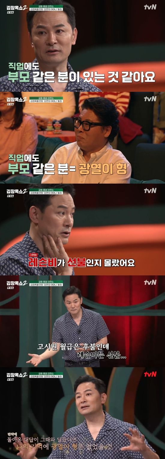 김창옥은 "자식이 없는 사람은 있어도 부모가 없는 사람은 없다. 자기 분야의 부모 같은 사람이 있는 거 같다. 저는 그게 광열이 형이고 제 선생님이다. 처음에 음악대학에 어떻게 들어가냐고 물어보니까 레슨이라는 걸 받아야 한다고 하더라. 저는 레슨비가 선불인지 몰랐다. 그때 뭐 20만 원인가 됐을 거 같다. 돈이 없는 거다. 제가 고시원 총무 했다. 고시원은 한 달 일하고 준다. 레슨은 선불로 내야 되고. '선생님 제가 한 달 있다가 드려도 될까요?' 이게 첫 기억이다. 그 말을 하기가 창피하더라. 그때 느낌이 되게 흔쾌히 '어. 그래' 했다. 그러니까 기억에 남는 거다"라며 회상했다.