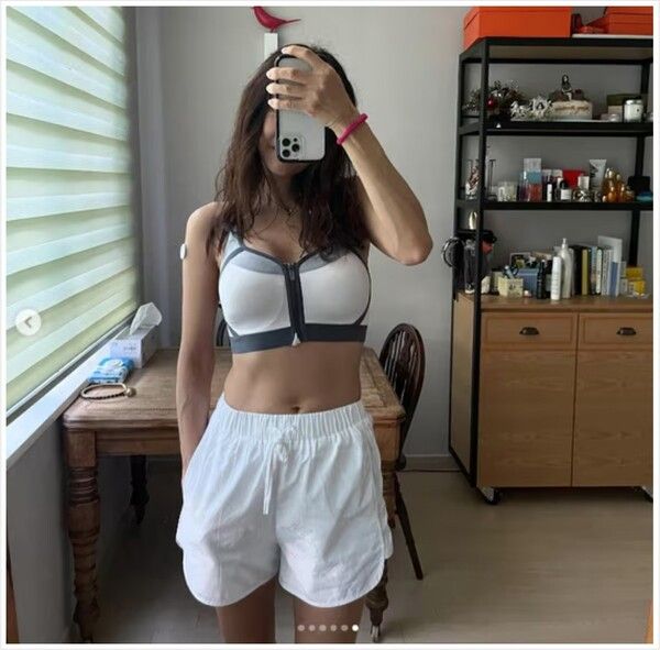 공개된 사진에서 윤현숙은 운동복 차림으로 거울 앞에서 포즈를 취하고 있다.