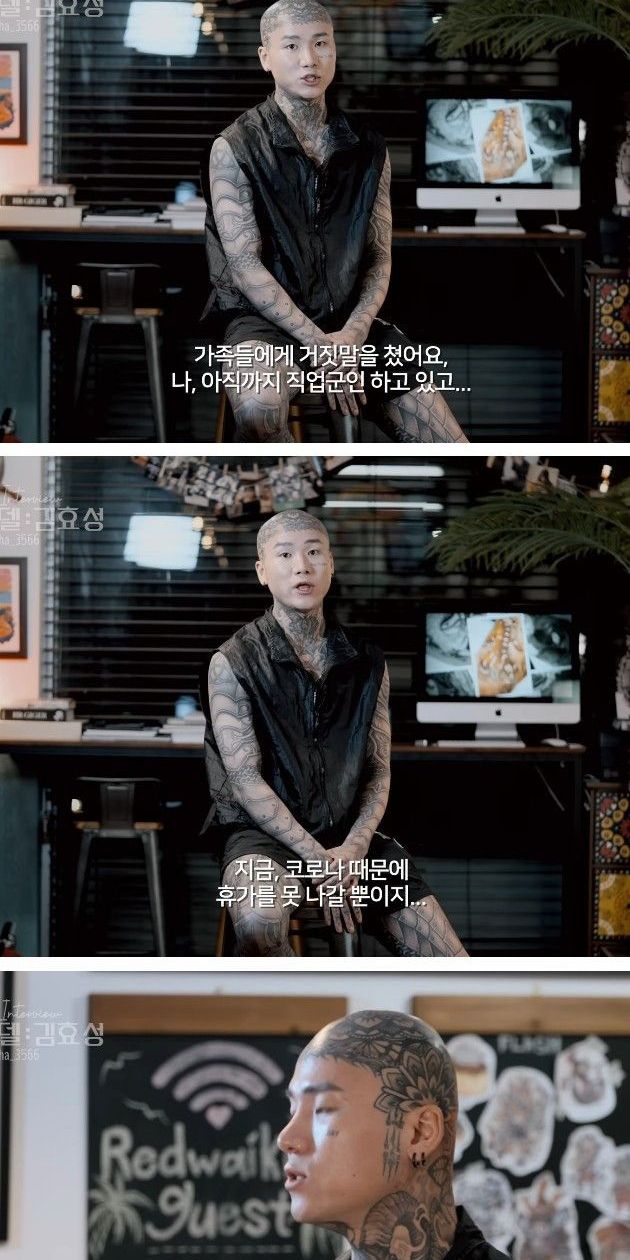 문신한거 보여주기 그래서 아직 군대에 있다고 거짓말 치다가 결국 모델 소속사 들어가서 가족들 만나러 감