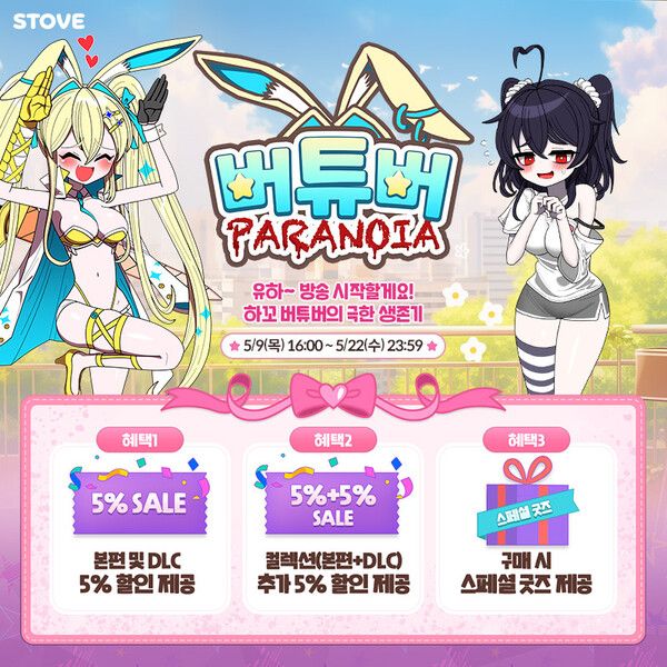 스토브는 ‘버튜버 파라노이아’를 5% 할인된 가격에 선보이며 특전으로 캐릭터 키링을 지급한다. ‘백(魄)의 소각자’ 구매자에게 출시 기념 월페이퍼 DLC를 제공한다. 이외에도 스토브는 참신하고 개성 넘치는 인디 게임을 엄선해, 구매자들에게 특전을 제공하는 ‘두근두근 야심작’ 프로모션을 22일(수)까지 진행한다. 해당 프로모션 기간 동안 추천 야심작 27종에 적용 가능한 5% 할인 쿠폰을 받을 수 있다.