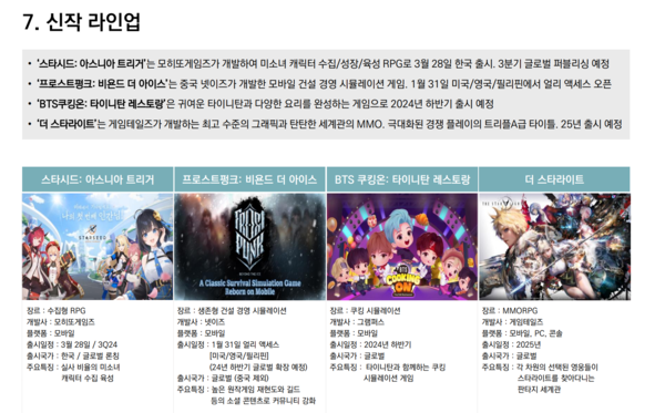 아울러 오는 2025년에는 PC·콘솔·모바일 멀티플랫폼 대형 MMORPG 신작 ‘더 스타라이트’가 퍼블리싱 신작 라인업에 합류할 예정이며, 넥슨 김대훤 전 부사장이 설립한 개발사 ‘에이버튼’이 개발 중인 MMORPG 신작 역시 성공적인 퍼블리싱을 위한 협업을 이어간다는 계획이다.