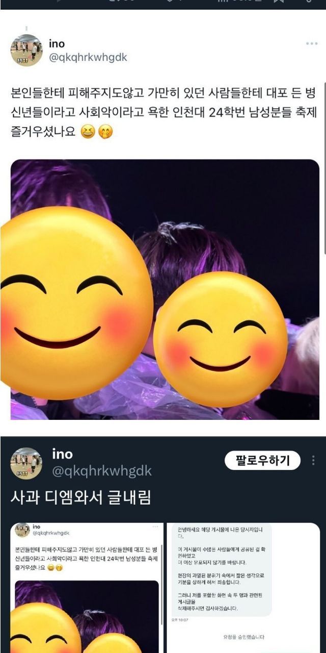 우리 욕한 인천대 남자분들 즐거우셨나요? 학생회 깡패인줄 ㅠㅠ (일반인 얼굴을 박제하며)