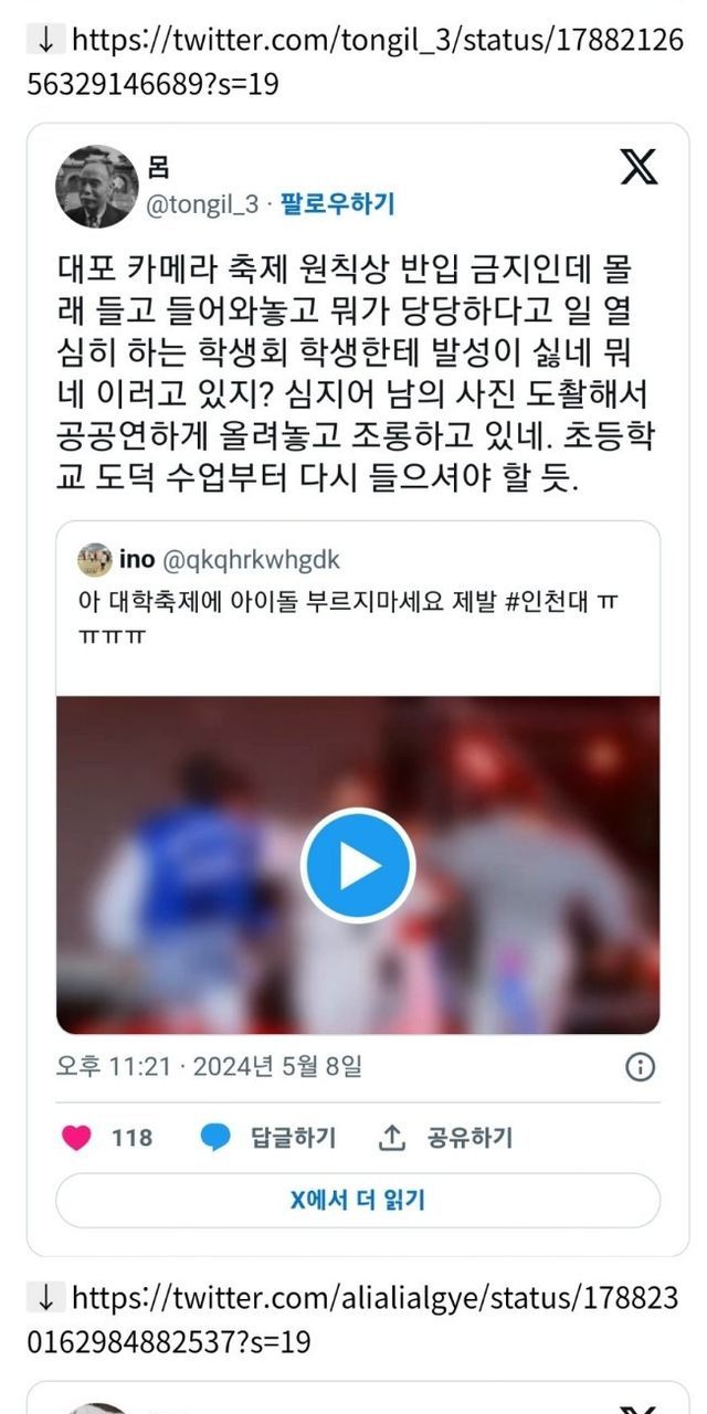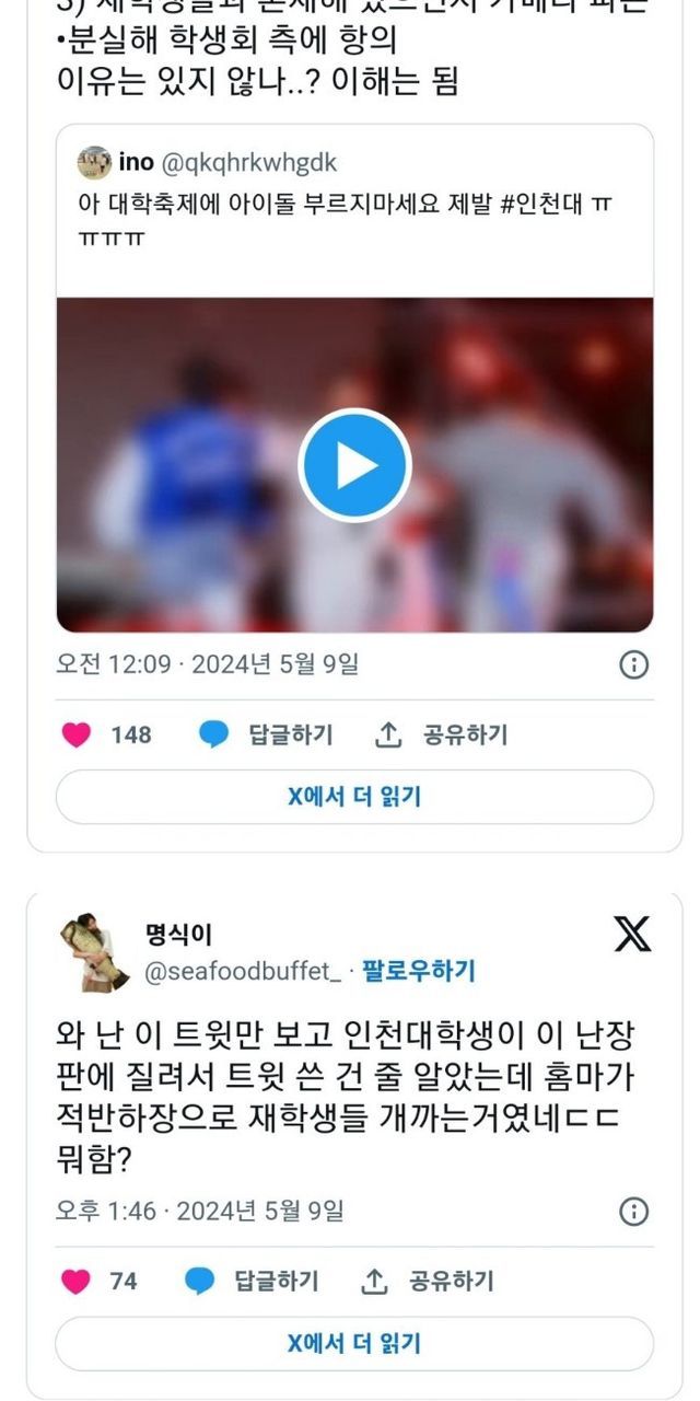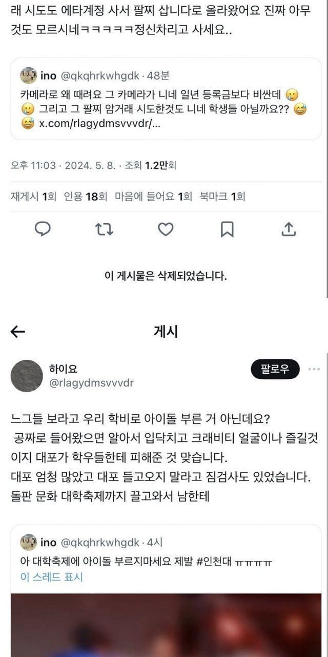 에브리타임에서는 사진 찍는 것에 방해 된다고 앞자리 인천대학생을 때렸다는 이야기도 나옴