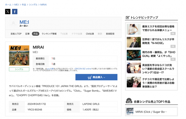 ‘프로듀스 101 재팬 더 걸스’에서 탄생한 일본 케이팝 걸그룹 ME:I(미아이)가 지난달 오리콘 주간 싱글 차트 1위, 첫주 발매 23.3만장 판매고를 기록하는 기염을 토했다.