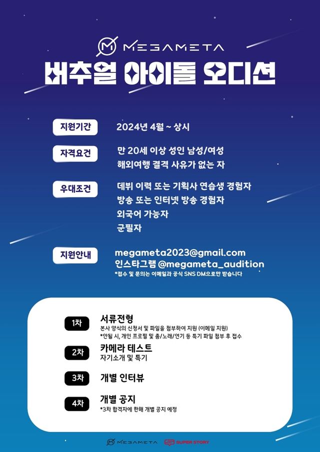 자격 요건은 만 20세 이상의 춤과 노래에 재능이 있는 성인이면 누구나 지원할 수 있으며 우대 조건은 데뷔 이력 또는 연습생 경험자나 방송 경험자, 외국어 가능자, 군필자로 메가메타 공식 메일과 신인개발팀 인스타그램 계정을 통해 지원이 가능하다. 자세한 사항은 공개된 공식 포스터 및 메가메타 공식 인스타그램(@megameta_audition)을 통해 확인할 수 있다.