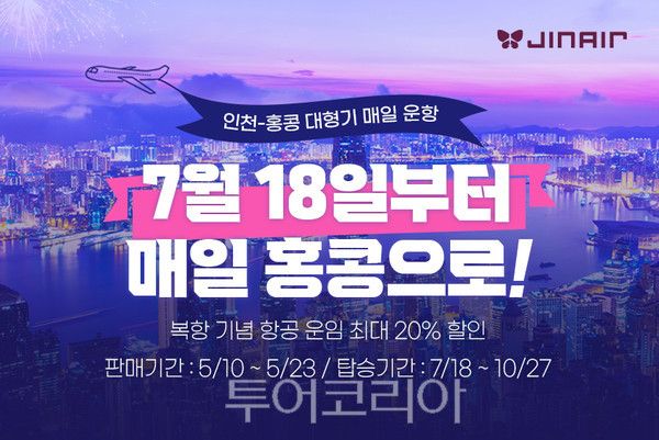 [투어코리아=정하성기자]진에어가 7월 18일부터 인천~홍콩 노선에 393석 규모의 중대형기 B777-200ER을 투입해 주 7회 일정으로 운항을 재개한다.