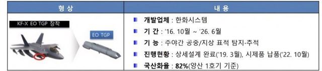 – EO TGP : 대공 및 대지 표적에 대한 주야간 탐지 및 추적 장비