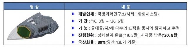– AESA 레이더 : 다수 표적을 동시 탐지, 식별, 추적하는 레이더