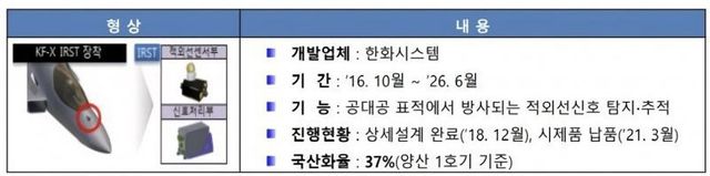 – IRST : 대상 표적의 적외선 신호를 탐지 및 추적하는 장비