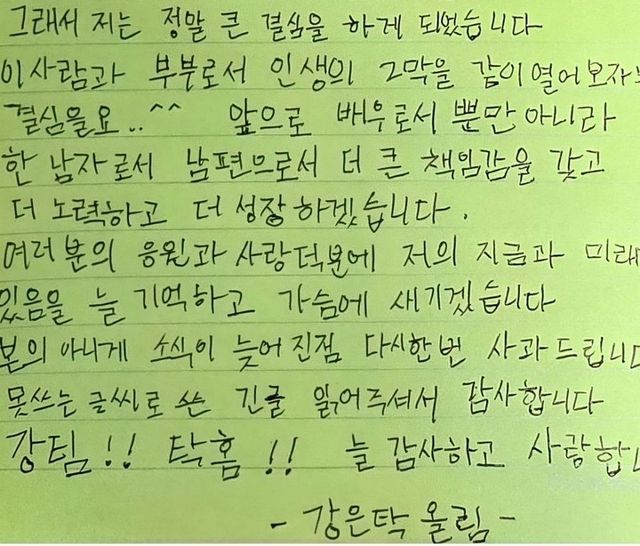 결혼 소식이 알려진 뒤인 지난달 30일, 강은탁은 자신의 소셜네트워크서비스를 통해 직접 쓴 손 편지로 소감을 전했다.