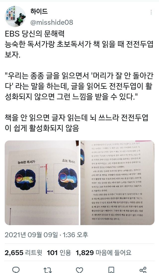 글을 잘 읽는 능숙한 독서가의 경우는 글자를 읽는 것보다는 글의 의미와 맥락을 파악해서 내용을 이해하고 해석하기 위한 인지 활동에 뇌를 더 많이 쓴다.