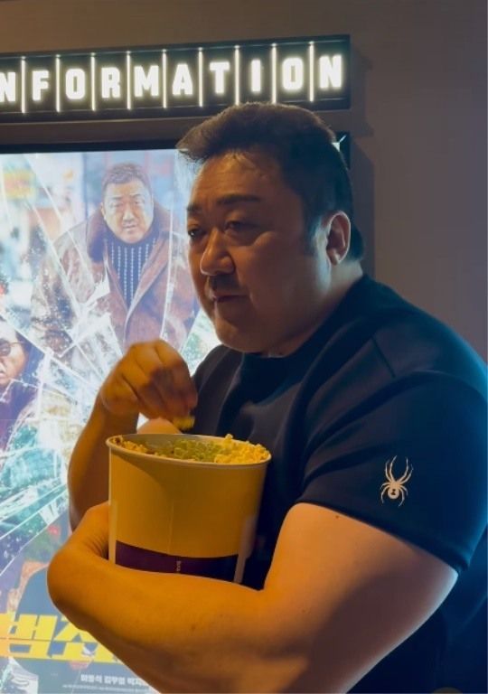 공개된 사진에는 팝콘통을 안고 팝콘을 먹고 있는 마동석의 모습이 담겼다. 마동석의 엄청난 팔뚝 탓인지 라지 사이즈 팝콘통이 '스몰'로 보여 웃음을 자아낸다.