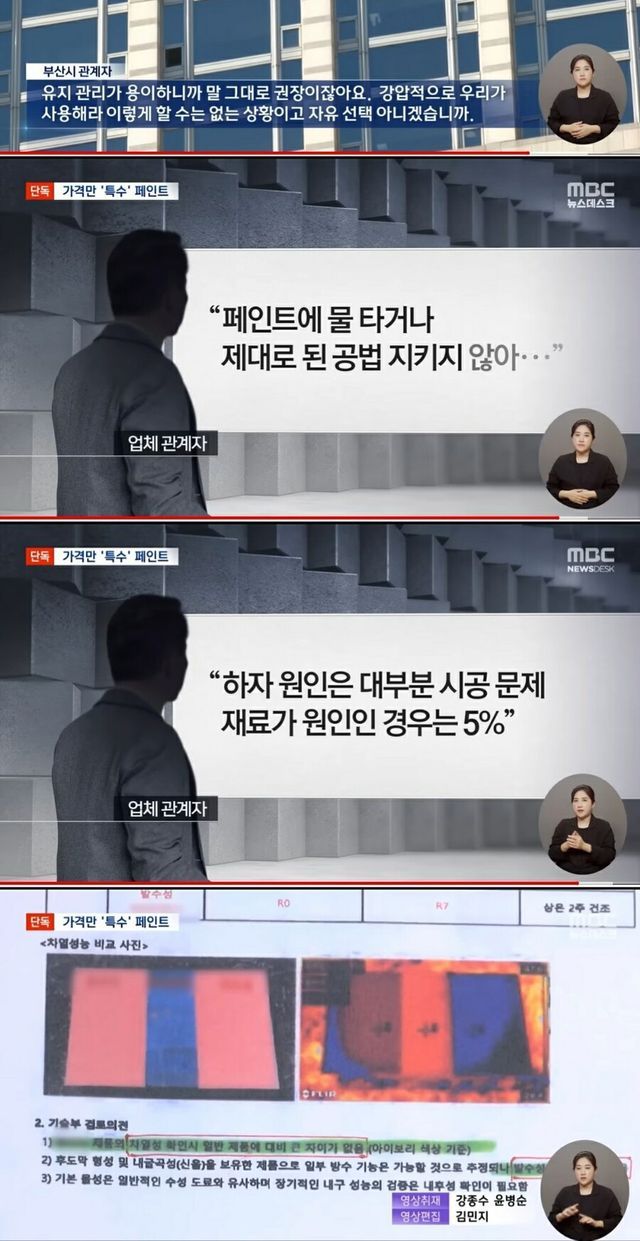 1. 부산의 신축 아파트들 페인트가 벗겨지고 갈라지고 하얀 액체가 흘러나옴, 액체가 고드름처럼 맺히기까지 함