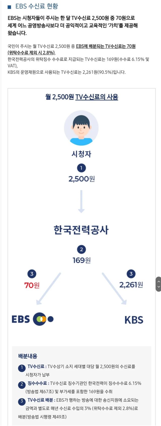 국민이 주시는 월 TV수신료 2,500원 중 EBS에 배분되는 TV수신료는 70원(위탁수수료 제외 시 2.8%),