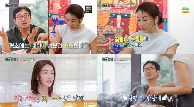진서연은 "(연극) 첫 무대 때 숨이 안 쉬어졌다"라며 "우울증과 공황증이 심했다"라고 털어놨다. 그는 "병원 다니며 우울증 치료를 받을 때 지금의 남편을 만났다"라고 회상했다. 남편의 긍정적인 면은 진서연의 변화를 이끌었다. 진서연은 "'어쩌면 나도 행복할 수 있겠구나'를 알게 됐다"라며 "그 사람 때문에 바뀌게 됐다"라고 말했다. 오랜 시간 진서연을 곁에서 지켜본 류승수는 "정말 남편 잘 만났네"라고 말했다.