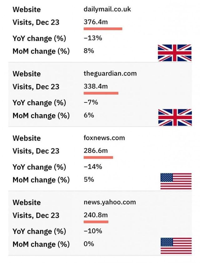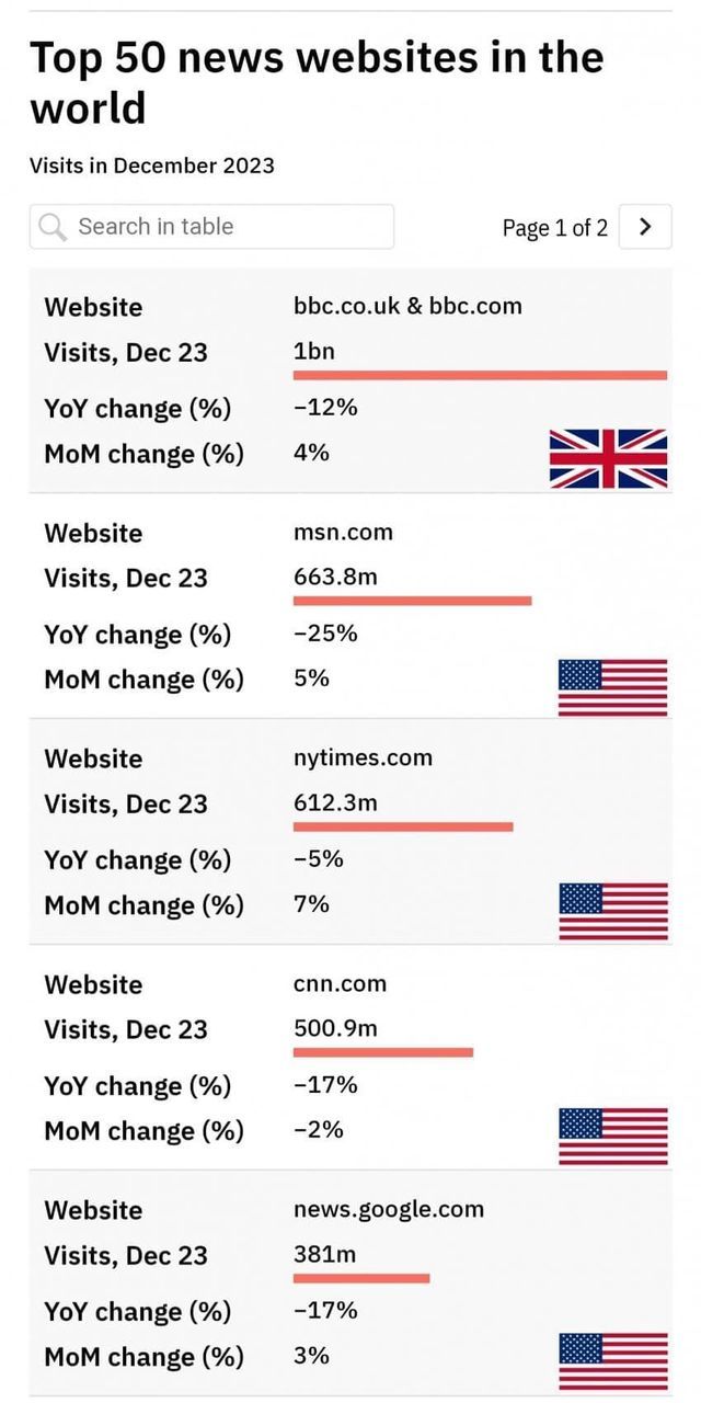 데일리메일, 가디언, 폭스뉴스 등이 뒤를 잇고있네요.