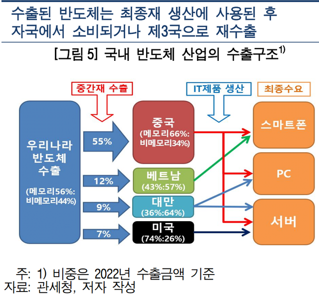 중국(55%)과 베트남(12%)은 우리나라로부터 수입한 반도체를 이용하여 스마트폰, PC, 서버 등 최종재를 생산한 후 이를 자국에서 소비하거나 주요 선진국으로 수출하고 있다. 미국(7%)의 경우 데이터센터 구축을 위한 메모리 반도체를 중심으로 우리나라 반도체를 수입하고 있다.