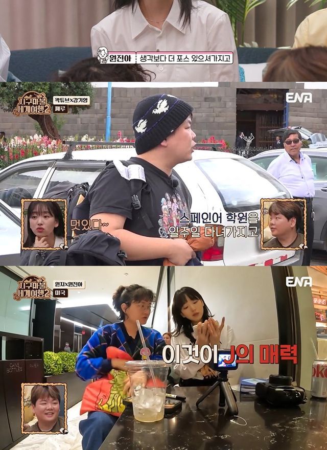 11일 방송된 ENA ‘지구마불 세계여행2’(이하 ‘지구마불2’) 10회에서는 브라질에 간 빠니보틀과 ‘여행초보’ 김도훈, 페루에 간 원지와 ‘파워 J’ 원진아 그리고 곽튜브와 ‘현지인’ 강기영의 4라운드 여행이 그려졌다. 스튜디오에는 새 여행 파트너 세 사람이 출연해 서로의 콘텐츠를 지켜보며 비하인드 토크를 나눴다.
