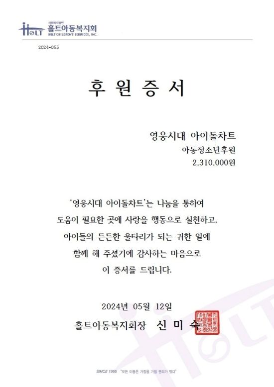 2017년 5월 12일 창단된 임영웅 팬클럽 '영웅시대'가 일곱 번째 생일을 맞이해 최근 231만 원을 홀트아동복지회에 기부했다. 이 기부금은 아동 및 청소년의 건강, 교육, 정서 및 자립 지원에 사용될 예정이다.