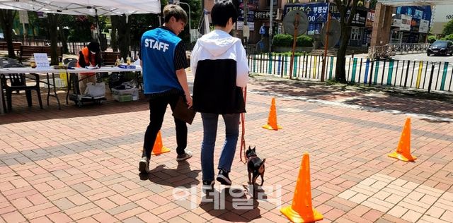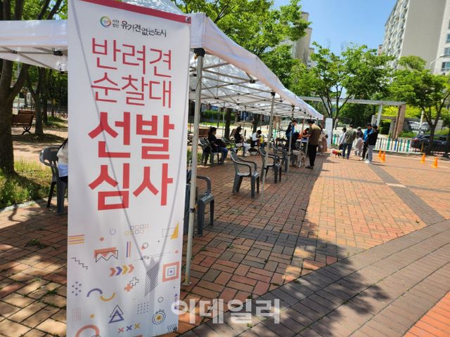 반려견 순찰대가 되려면 1차 서류심사와 2차 실기심사를 거쳐 100점 만점에 70점 이상을 받아야 한다. 실기심사에서는 △기다려(보호자와 편안하게 떨어져 있는지), 이리와(보호자의 부름에 바로 달려가는지) △ 리드워킹(줄 느슨하게 당기지 않고 걷기) △대인반응(낯선 사람이 다가올 때 보호자 옆에서 침착하게 대응하는지) △대견반응(멀리서 다른 개를 봤을 때 보호자에게 집중하는지) △순찰대 활동 적합성 확인(기본 펫티켓에 대한 문답) 등을 종합적으로 평가한다. 로제의 주인은 “오늘 1시간 일찍 와서 공원을 돌아다니며 적응 시간을 가졌다”며 “심사에 통과해서 당당하게 순찰견 마크를 붙이고 우리 동네 치안에 보탬이 되고 싶다”고 포부를 밝혔다.