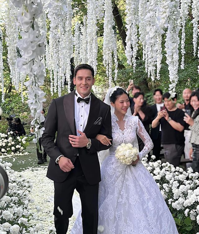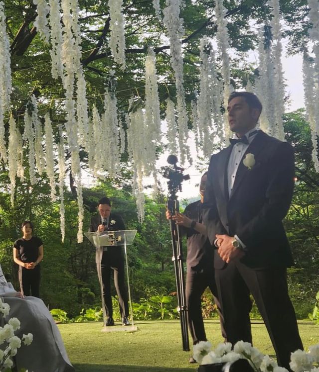 사진 속 줄리엔강과 제이제이는 화려하게 세팅된 야외 결혼식장에서 웨딩드레스와 턱시도를 차려입고 포즈를 취하고 있다.