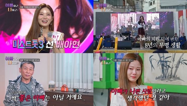 '미스트롯3' 배아현이 무명 시절을 버틸 수 있게 물심양면 지원해준 아빠와의 풀지 못한 이야기, 그리고 '외톨이 아빠' 김병옥과 딸의 오해를 풀기 위한 대화 현장은 15일(수) 밤 10시 TV CHOSUN '아빠하고 나하고'에서 방송된다.