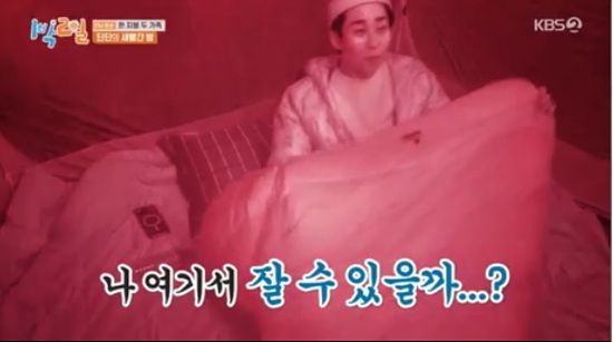 나홀로 텐트 취침을 하게 된 딘딘은 석상 뷰 투명 텐트를 보고 "이게 실존하는 텐트가 맞는 거냐"면서 어이없다는 듯 웃었다.