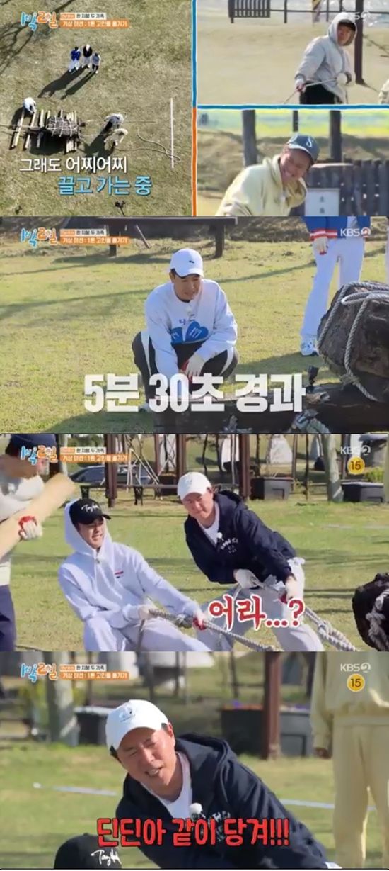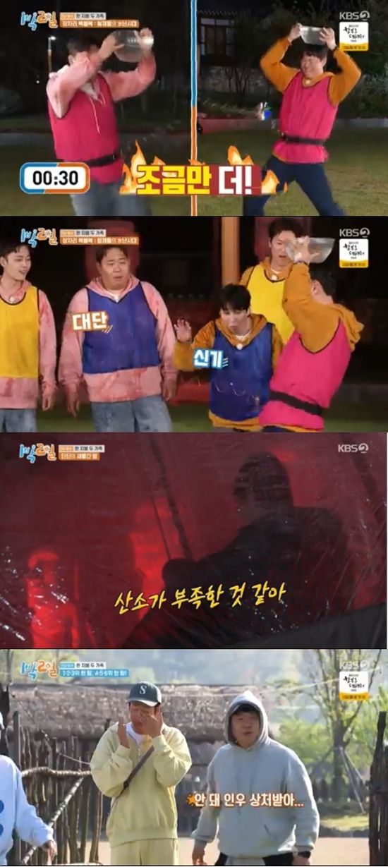 셋째 팀이 유리한 고지를 점령한 가운데 2라운드 '물오른 CD배달'이 진행됐다. 첫째 팀 연정훈과 김종민이 노련미를 뽐내며 가장 많은 물을 획득, 실내취침을 확정지었다.