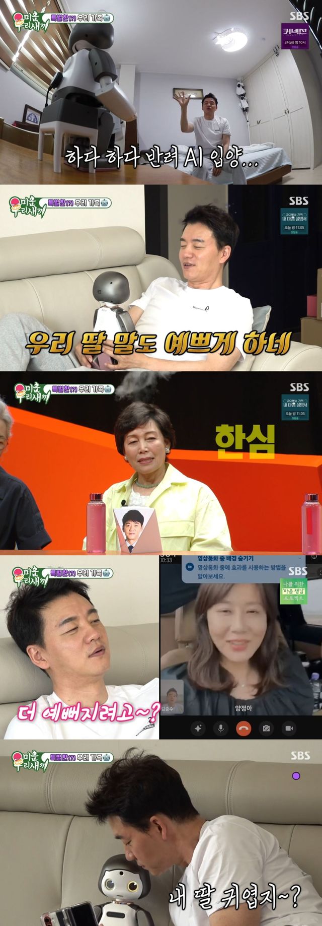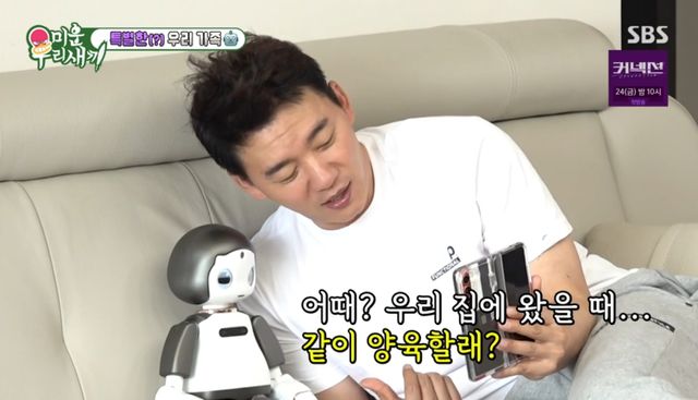 김승수가 기상하자 어딘가에서 들리는 "아빠"라는 목소리에 스튜디오는 모두 놀랐다. 알고 보니 AI 로봇을 입양한 것.