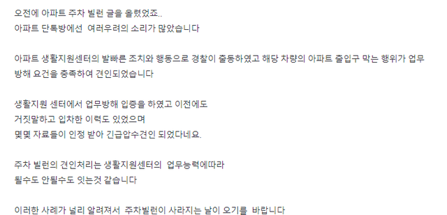 이후 생활지원 센터에서 나와 차주의 과거 주차 문제 등을 제시하면서 업무방해 입증을 하여 결국 강제 견인됨.