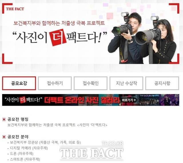 특종에 강한 신개념 대중 종합지 더팩트가 '보건복지부와 함께하는 저출생 극복 프로젝트 <사진이 '더'팩트다>' 사진 공모전을 연다. 이번 보건복지부와 함께하는 저출생 극복 프로젝트 <사진이 '더'팩트다>는 제7회 사진공모전 "사진이 '더' 팩트다"의 일환으로 열린다.