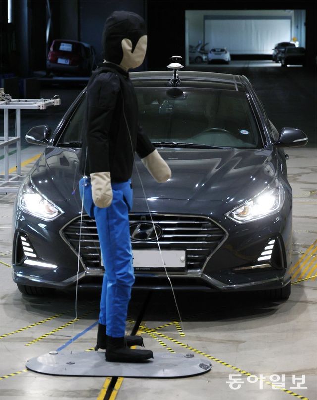 3일 경기 이천시 보험개발원 자동차기술연구소에서 첨단운전자지원시스템(ADAS) 중 하나인 비상자동제동장치(AEB)가 제대로 작동하는지 확인하기 위해 전방에 보행자가 있는 상황을 가정한 실험이 진행되고 있다. 이천=양회성 기자 yohan@donga.com