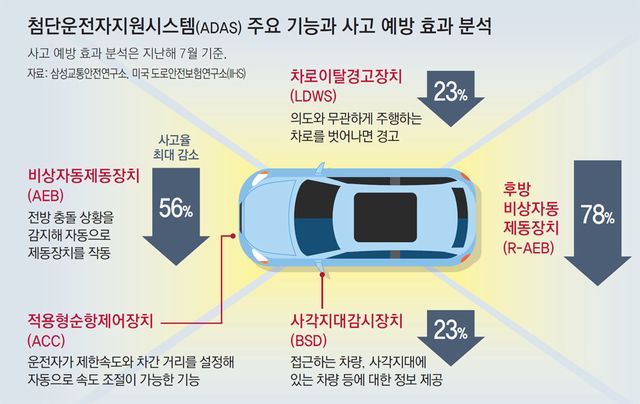 ADAS의 사고 예방 효과는 명확하다는 게 전문가와 연구 결과의 공통적인 결론이다. 2019년 9월 미국 미시간대 교통연구소와 제너럴모터스(GM)가 GM 차량 370만 대에 대한 데이터를 조사한 결과, ADAS는 사고 가능성을 최대 80% 이상 경감시키는 것으로 나타났다. 지난해 7월 미국 도로안전보험연구소(IIHS)가 실시한 ADAS 사고 예방효과 분석에서도 ADAS는 전방 추돌 가능성은 최대 56%, 후방 충돌은 최대 78% 예방하는 것으로 나타났다.