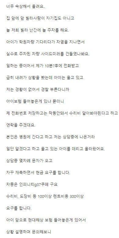 2. 애 엄마한테 사이드미러 작동 안된다고 수리비 요구 (보험 처리 시 400만원 / 현금 60만원)