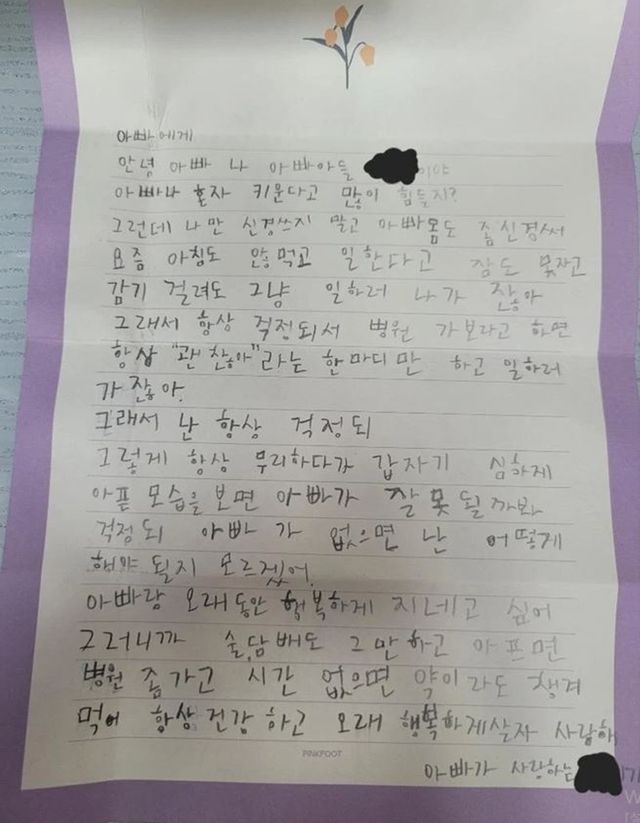 또한 "걱정돼서 '병원 가보라'고 하면 아빠는 항상 '괜찮아'라는 한마디만 하고 일하러 가잖아. 무리하다가 갑자기 심하게 아픈 모습을 보면 아빠가 잘못될까 봐 걱정돼"라며 "아빠가 없으면 난 어떻게 해야 할지 모르겠어"라고 썼다.