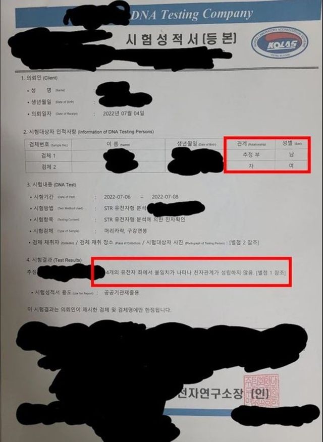 글에 따르면, A씨는 그해 6월 아내가 남자와 모텔 들어가는 외도 현장을 잡고 이혼 소송 중이다. 한 달여 뒤인 7월 딸에 대한 친자 검사를 의뢰한 A씨는 '4개의 유전자 좌에서 불일치가 나타나 친자 관계가 성립하지 않음'이라는 결과를 받았다.