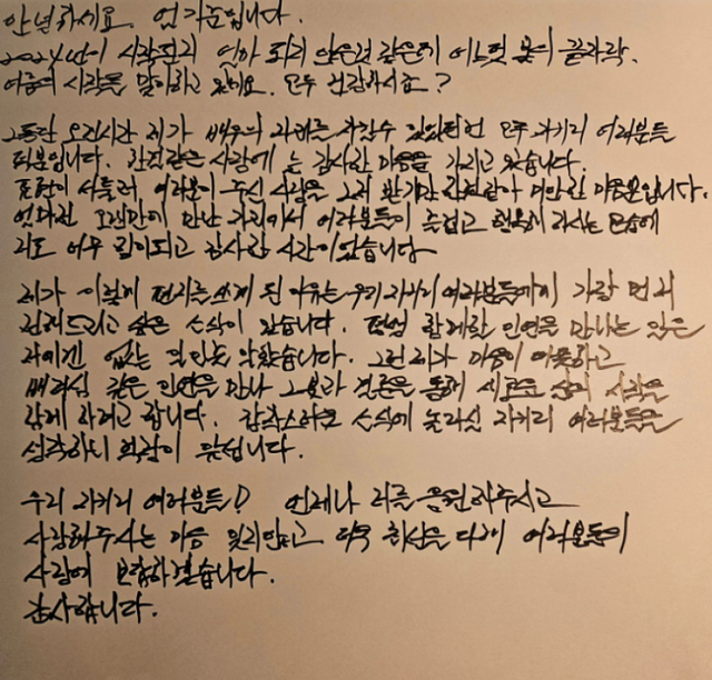 제가 이렇게 편지를 쓰게 된 이유는 우리 지키리 여러분들에게 가장 먼저 전해드리고 싶은 소식이 있습니다. 평생 함께할 인연을 만나는 일은 저에겐 없는 일인줄 알았습니다. 그런 제가 마음이 따듯하고 배려심 깊은 인연을 만나 그 분과 결혼을 통해 새로운 삶의 시작을 함께 하려고 합니다. 갑작스러운 소식에 놀라실 지키리 여러분들을 생각하니 걱정이 앞섭니다.